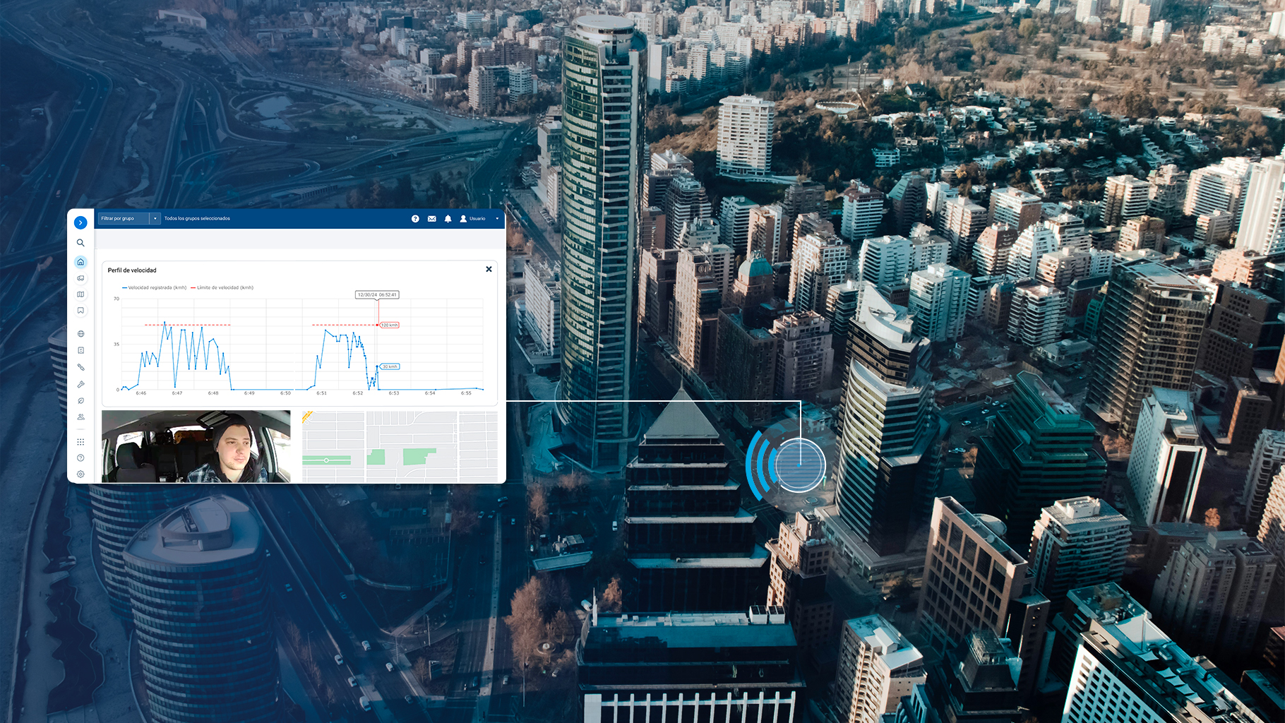 Vista aérea de una ciudad en Chile con un gráfico de velocidad y una imagen de un conductor superpuesta, representando soluciones de telemetría y telemática avanzadas para la gestión de flotas