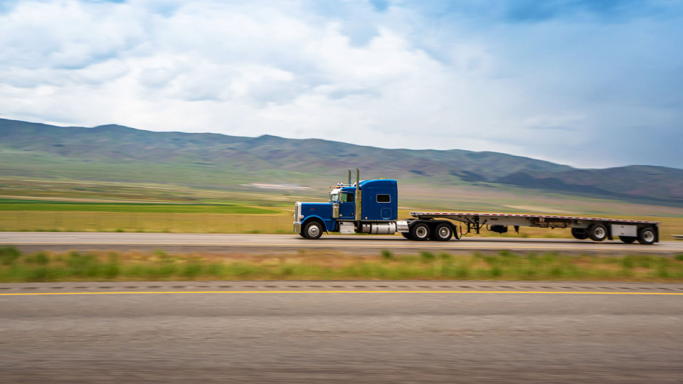 Camión de carga azul con remolque vacío en carretera montañosa bajo un cielo parcialmente nublado, representando la logística de transporte.